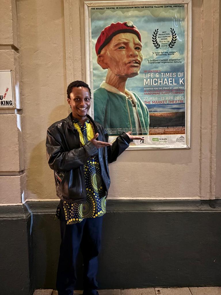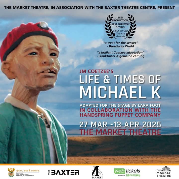 I was at the Market Theatre to watch “The Life and Times of Micheal K”, a novel by JM Coetzee adopted by Lara Foot. The story is told through puppetry and physical theatre. The story is of a man named Michael K, who along with his very sick mother make an arduous journey from Cape Town to her mother’s rural birthplace in Prince Albert amid a fictitious civil war during the apartheid era. To get there Michael K builds a shoddy rickshaw to carry her mother. Along the way they head into some trouble, they don’t have the right paperwork and permits and the little money they have gets confiscated by soldiers. His mother ends-up in the hospital and passes on. She is cremated. Alone, dejected, hungry and with nothing Micheal K carries on the journey to Prince Albert to scatter her dead mother’s ashes. Along the way, he is exploited for cheap labor and he goes through an intense starvation period. Soldiers also misidentify him as a rebel and keep him hostage but he survives and escapes finding his way back to his mother’s apartment in Cape Town. It is revealed that Micheal K has a deformity, a cleft lip and because of this deformity people tend to treat him like he is lesser, slow.